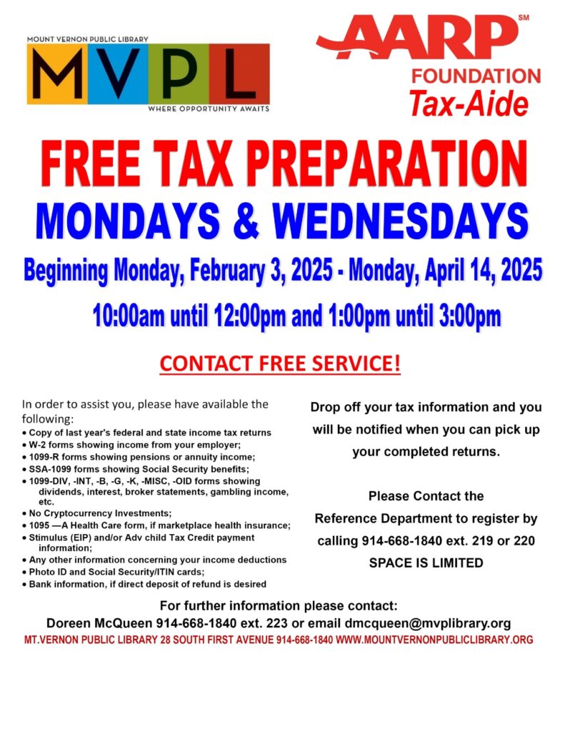 AARP Tax Aide 2026 0 By David Cambillo Community, News AARP offers free assistance for federal and state returns. Mondays and Wednesdays from Monday, February 2, 2026through Wednesday, April 15, 2026, from 10:00 am – 12:00 pm. and 1:00pm – 3:00pm. Appointments are required. TAX 2025 FLYER.PDF